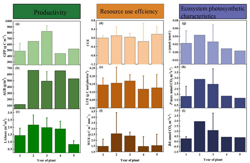 Fig. 7. Dynamic of the annual cumulative gross primary productivity (GPP, a), aboveground biomass (AGB, b), leaf area index (LAI, c), carbon use efficiency (CUE, d), light use efficiency (LUE, e), water use efficiency (WUE, f), ecosystem apparent quantum yield (α, g), maximum rate of gross CO2 assimilation (Pmax, h) and daytime ecosystem respiration rate (Rd, i) in different year of plant.