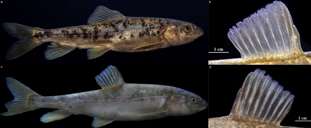 Figure 2. Pictures of S. chengi and S. malacanthus. a. The lateral view of S. chengi. b. Dorsal fin of S. chengi. c. The lateral view of S. malacanthus. d. Dorsal fin of S. malacanthus.